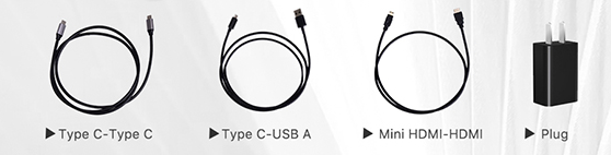 ちなみに付属のコードは上記3種で、TYPE-C to TYPE-C、TYPE-C to USB A、Mini HDMI to HDMIのケーブルが付属し、プラグは日本でそのまま使える形状です。到着後すぐに様々な機器に接続可能です。