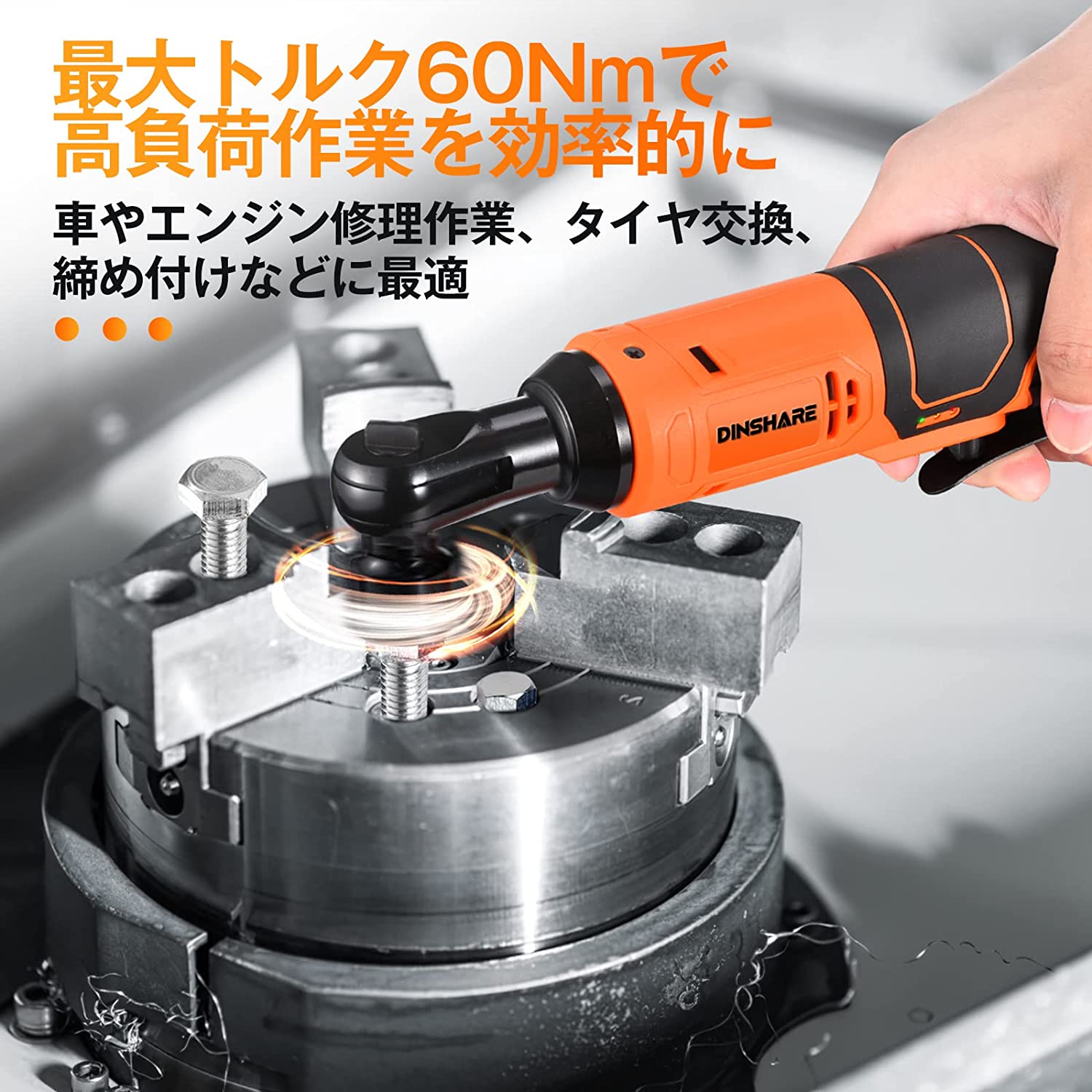 DINSHAREの電動ラチェットレンチは、16.8V 2.0Ahの大容量バッテリート強力な純銅モーターを採用し、最大60Nmのトルクを提供し、400 RPM高速な回転速度でタイヤ交換や、DIY作業の効率化を図れます。