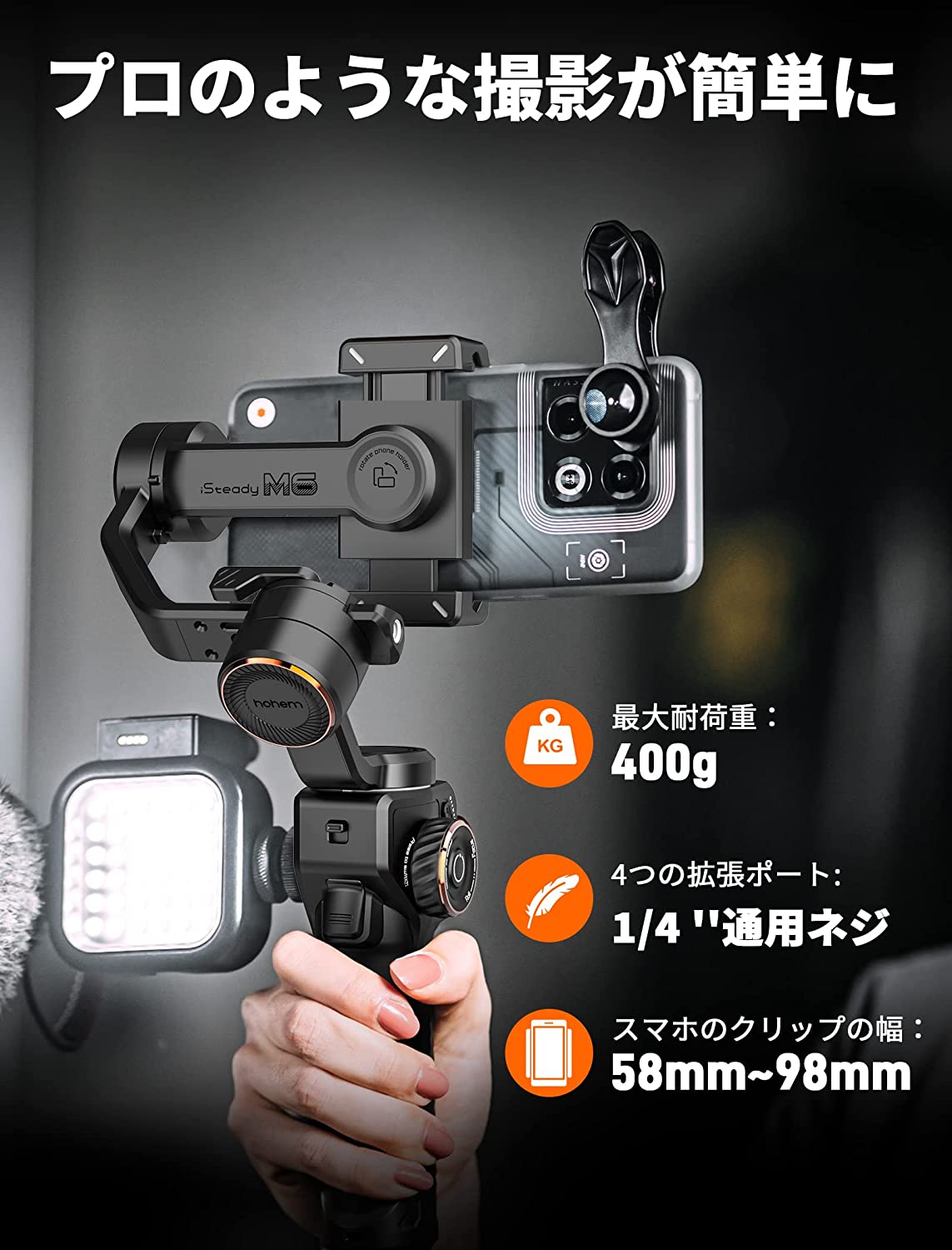 Hohem M6シリーズは、スマホ用のジンバルですが、なんと最大耐荷重400gに対応。スマホに外付けの広角レンズやマイクなどをつけても耐えうる耐荷重です。携帯電話の幅は58〜98mmのモデルに対応で、アプリはAndroid、iPhoneともに対応しています。