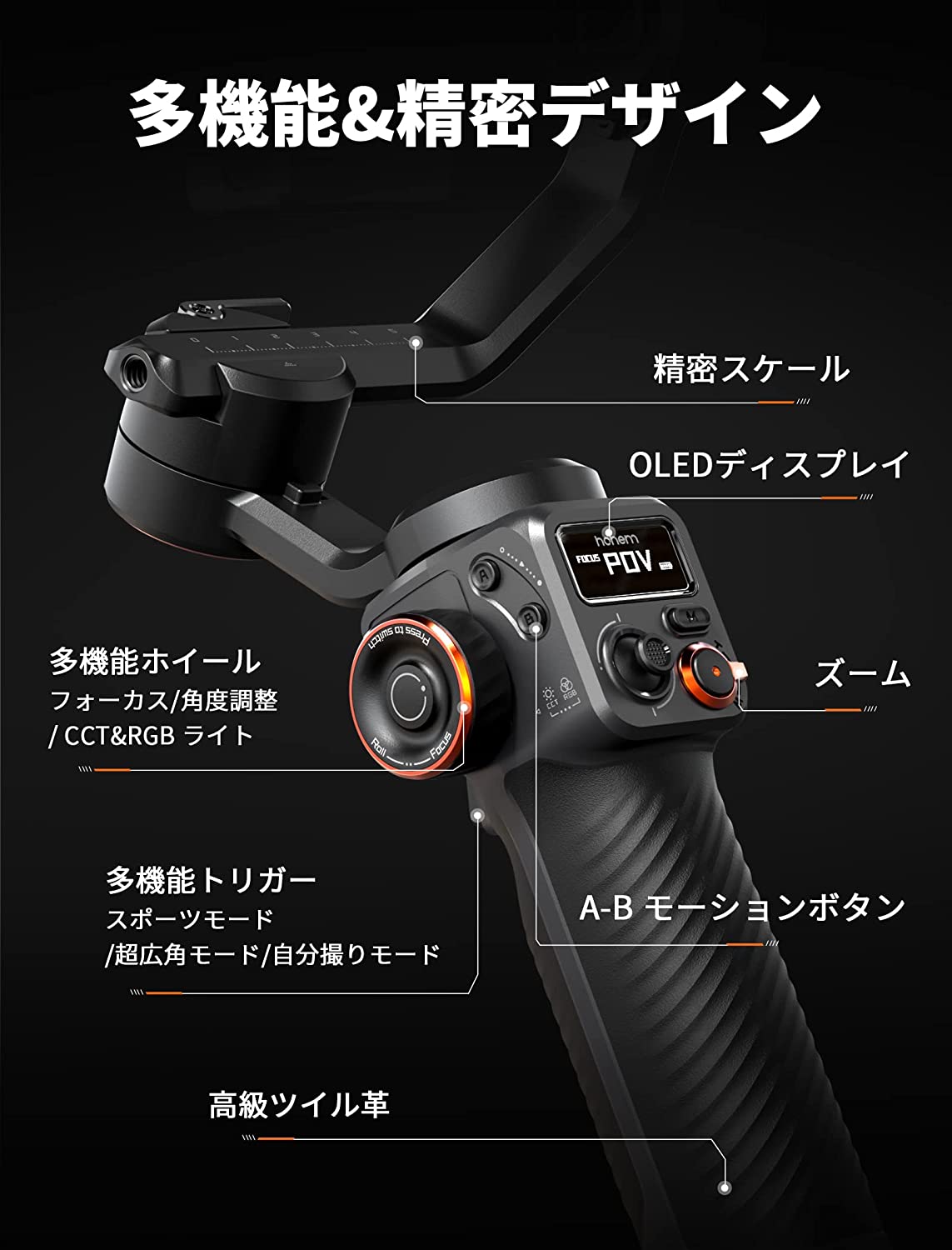 Hohem M6シリーズは、とても多機能。フォーカス、回転角度、マルチモードの切り替えができる物理リモコンをハンドルに集約して搭載。微調節が簡単で、スマホでプロ並みの撮影が可能です。