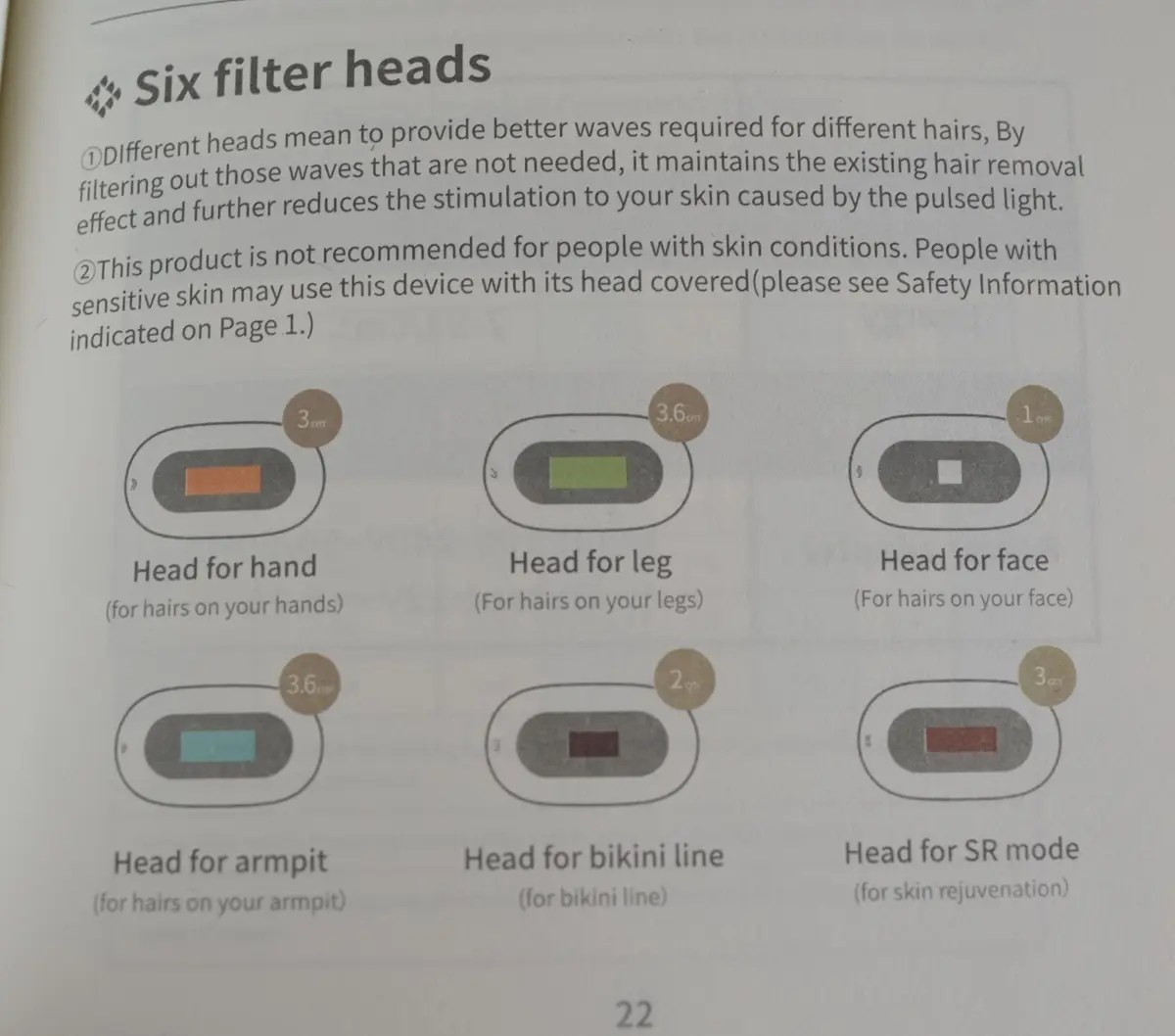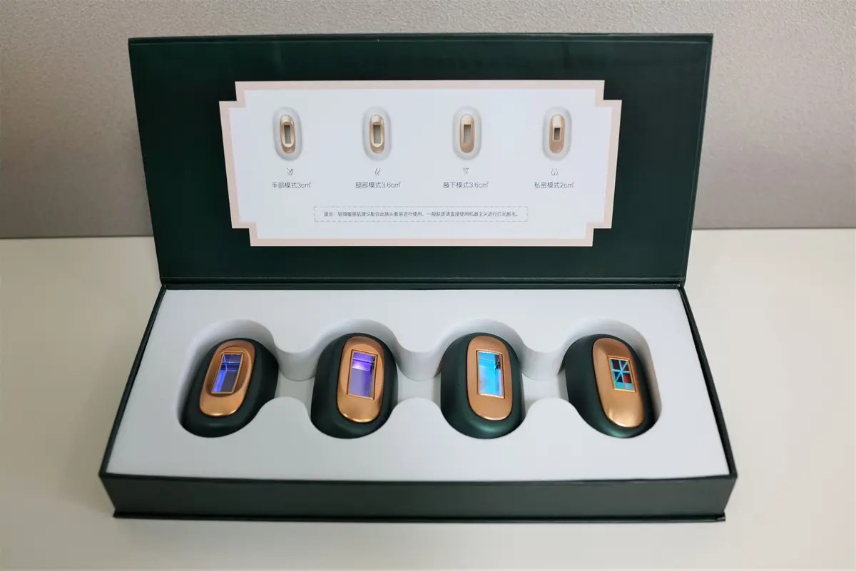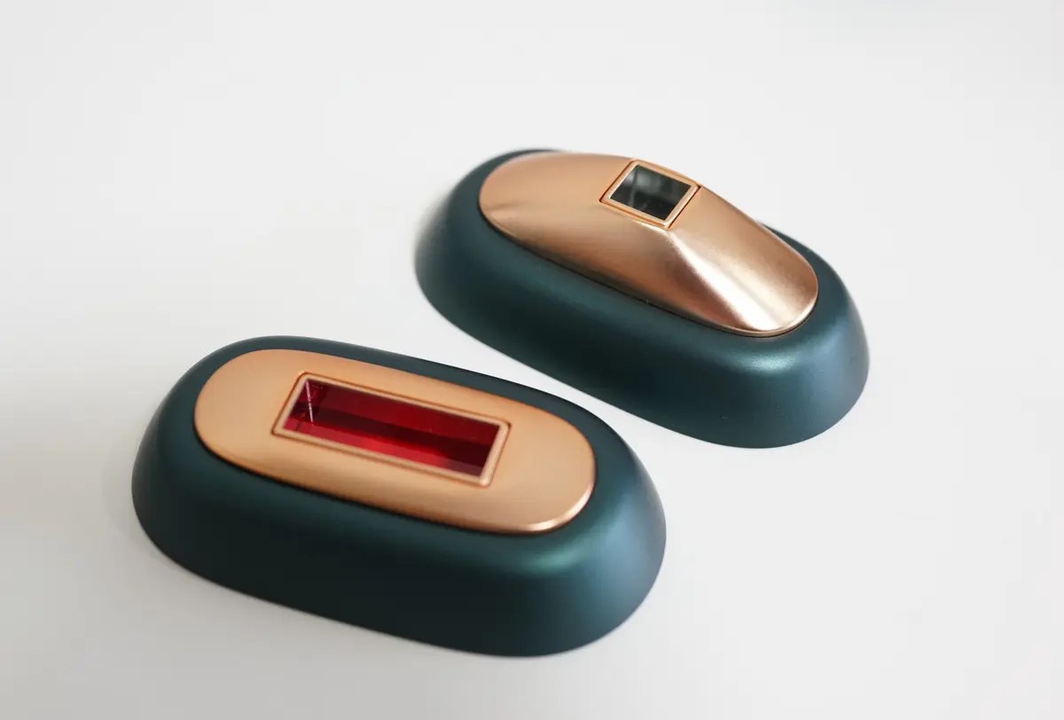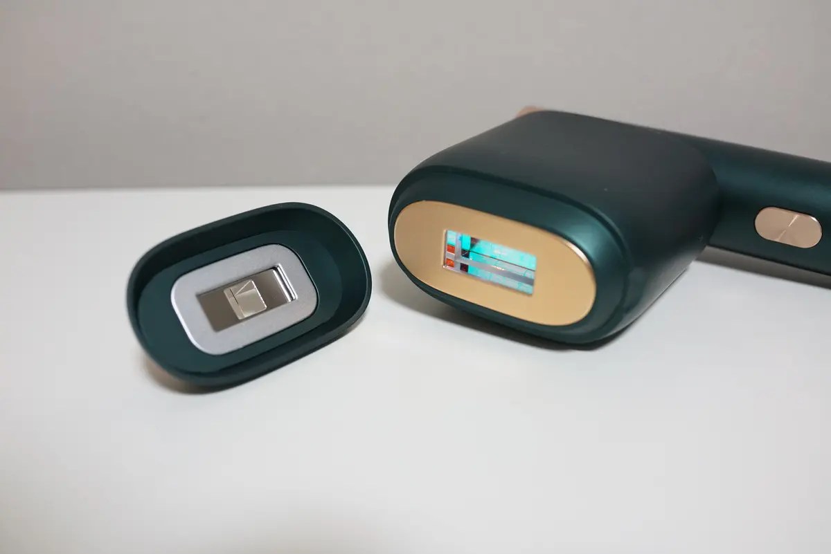 この2つは赤く見える方がスキンケア用のヘッドで、凸している小さなヘッドが顔の毛用です。顔の毛用は小さくしてあるので、髭など狙いうちしやすいし、ホクロも避ける事ができるので便利ですね。顔は小さなホクロが沢山ある人もいると思うので、この形状は最高だと思いました。スキンケア用の照射を繰り返すと、シミとシワが消えるとの事で、このようなサロンでないと受けられないような美容も自宅でできるのは良いですよね。