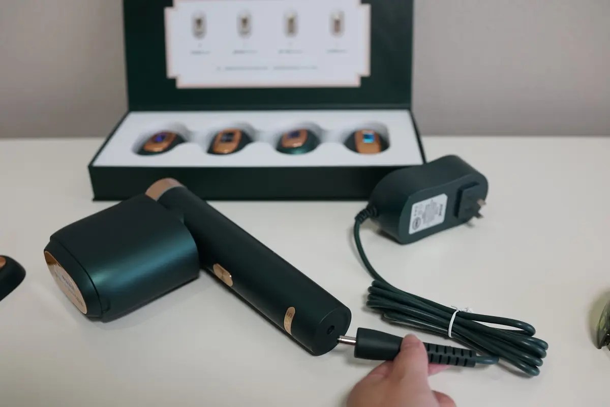 コンセントは日本対応で、底部に挿しこんで使います。コンセント式なので、充電を気にせず使いたい時に使えます。IPL脱毛機はどうしても発熱しちゃうので、連続2時間以上の利用はできませんし、コンセントの近くで利用する必要がありますが、バッテリーのへたりや残りを気にせずに利用できるコンセント式はやはり便利です。