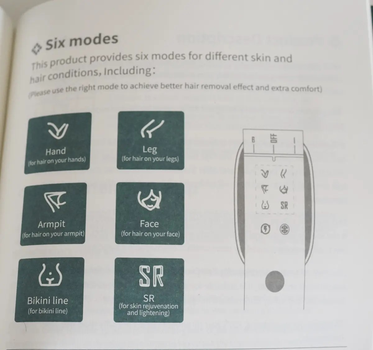 JOVS VENUS PROは6つのモードを搭載しており、腕、脚、脇、顔、ビキニライン、SR美顔モードがあります。