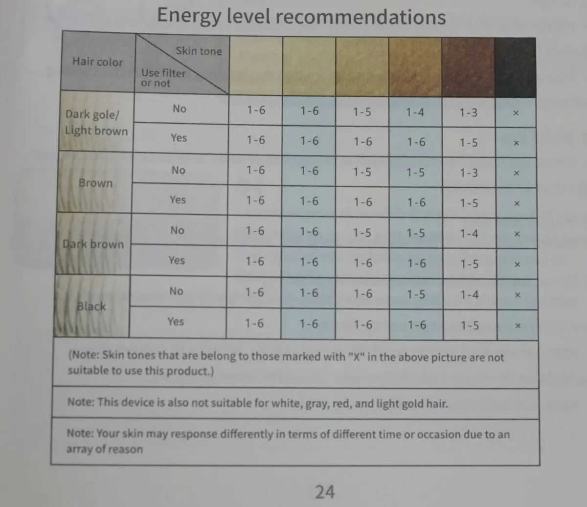 これはIPL脱毛機全般に言える事で、JOVS VENUS PROに限った事ではありませんが、このようにカラーチャートを説明書に記載してくれているのはありがたいですね。まずは痛みを感じない範囲の1~3ぐらいで照射して問題なければ出力を上げていくみたいな使い方が良さそうです。