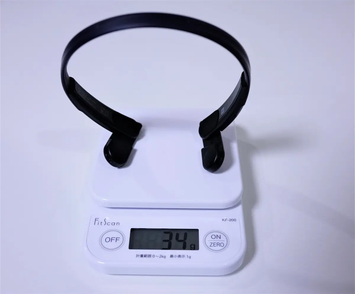 重量はわずが34g。これよりも軽い耳掛け式のイヤホンも所有しておりますが、Mu6 Ringのフィット感が良いのか、Mu6 Ringの方が軽く感じます。ソフトな締め付けで頭が蒸れないので髪型が崩れないのも個人的にはポイント高いです。