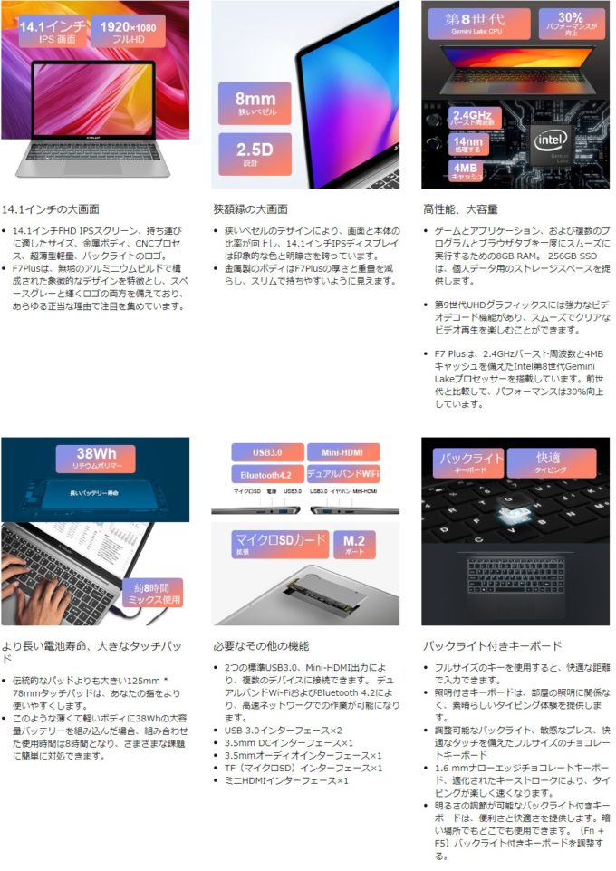 Teclast F7 PlusのCPUはIntel Celeron Gemini Lake Nシリーズとの記載ですが、最大2.4GHzとの記載がある為おそらくN4100と予想し記載しております。Intel Celeron Gemini Lake Nシリーズは、高解像度の写真や動画の編集やゲームには向きませんが、SNSのチェックやネットサーフィン、動画の再生、ライトなオフィス作業に向いています。ディスプレイが14インチと大きく、またキーボードはフルサイズでタッチパッドも大きくとってあり、ソフトを沢山起動したりしてハードな使い方をしない限りは快適に使えるのではないかと思います。