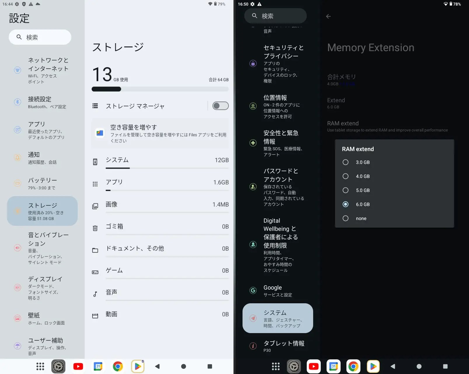 メモリ拡張機能は、設定のシステムから1GB刻みで最大6GBまで拡張させることができますが、デフォルトで6GBの拡張機能は解放されており、最大の10GBになっています。